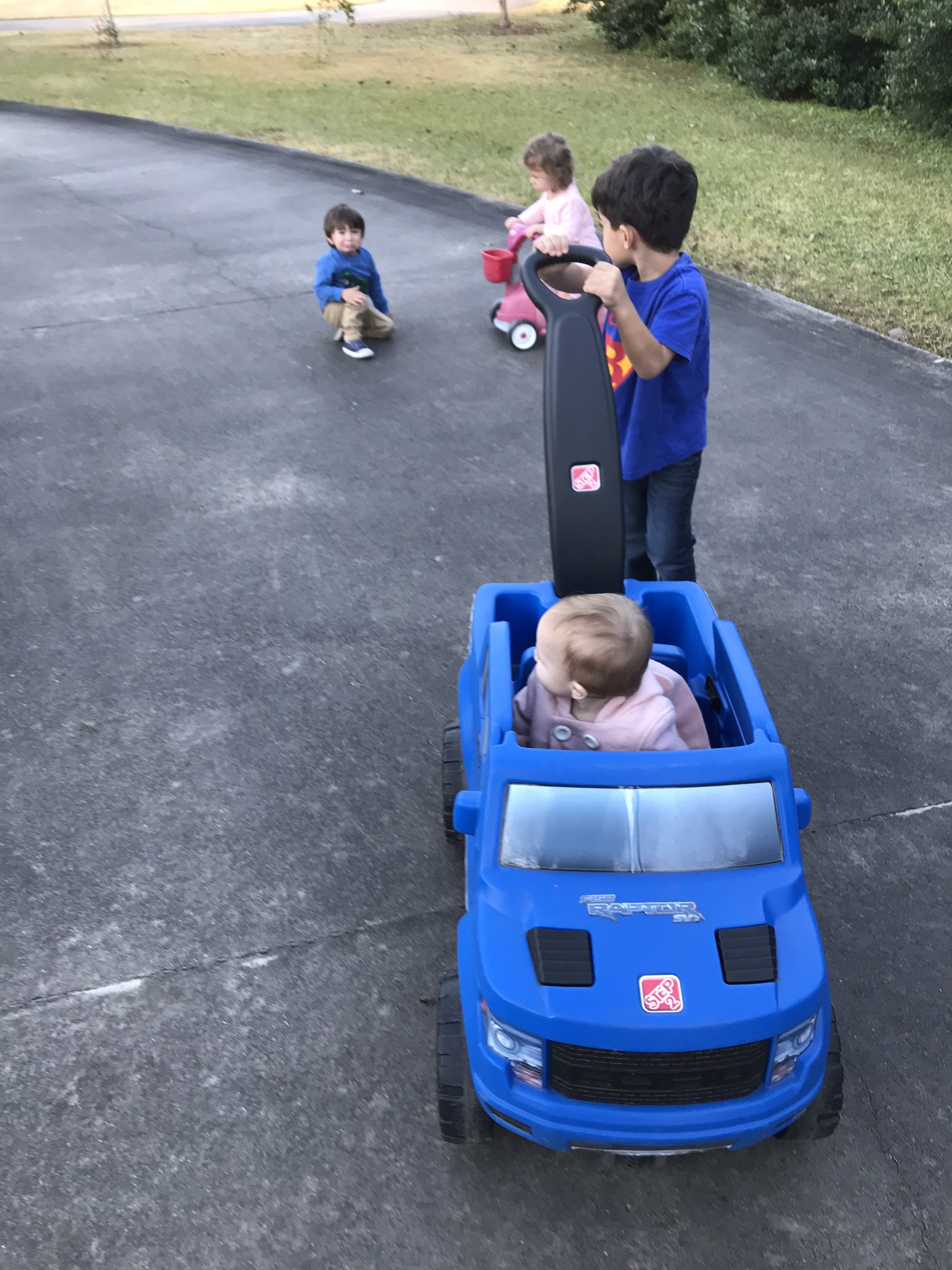 Ollie was very excited to let Brad ride in her car seat while she rode in Evie’s on their way to Nemo’s house for the night