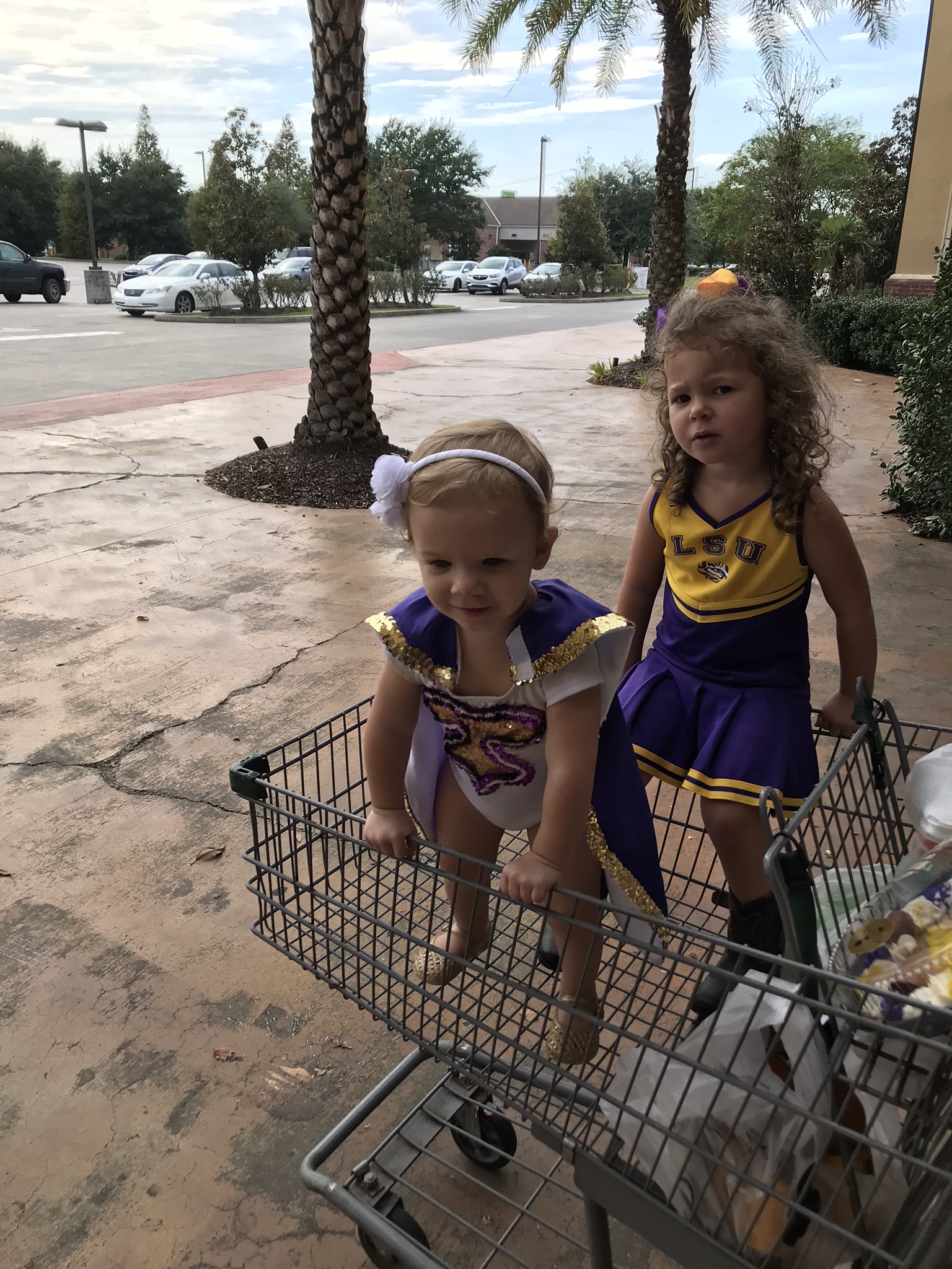 Too hot to tailgate for the Northwestern St. game, so the girls put on their gameday gear to go to the grocery store.