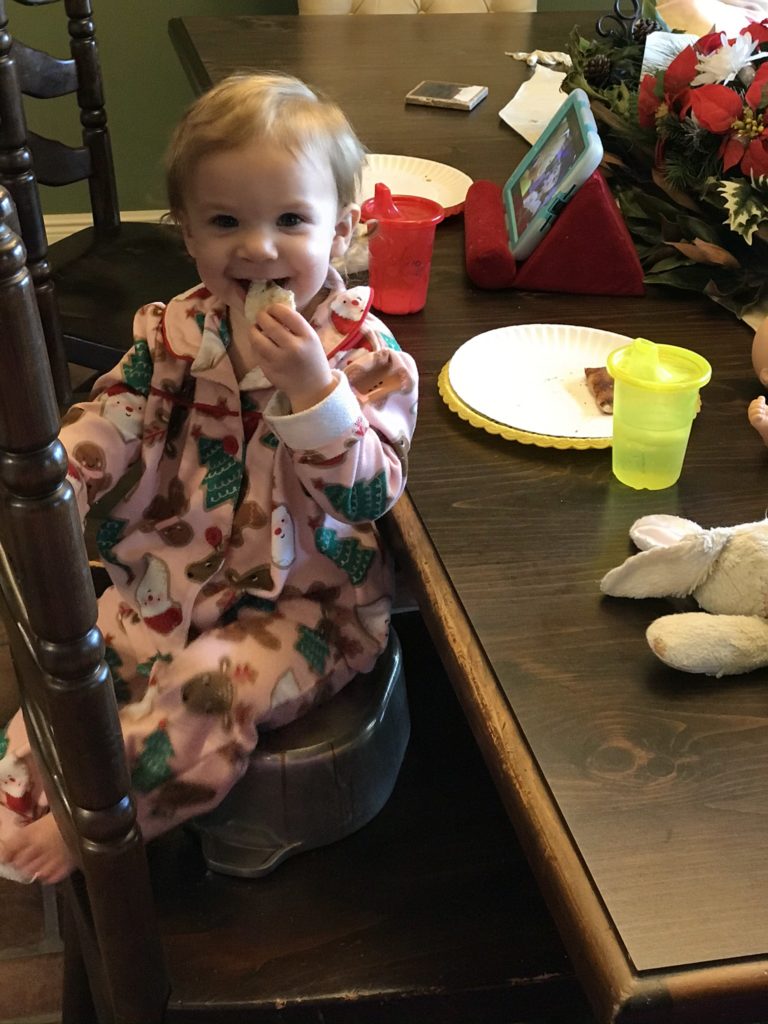 And enjoying some cinnamon toast on her cajun booster seat (a magnalite pot)