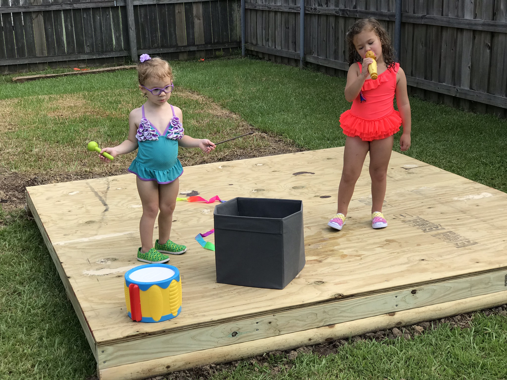 Grandpa came in to start the girls’ playhouse in the backyard. The floor is now built, but to keep the surprise we’re telling them it’s a “stage”.
