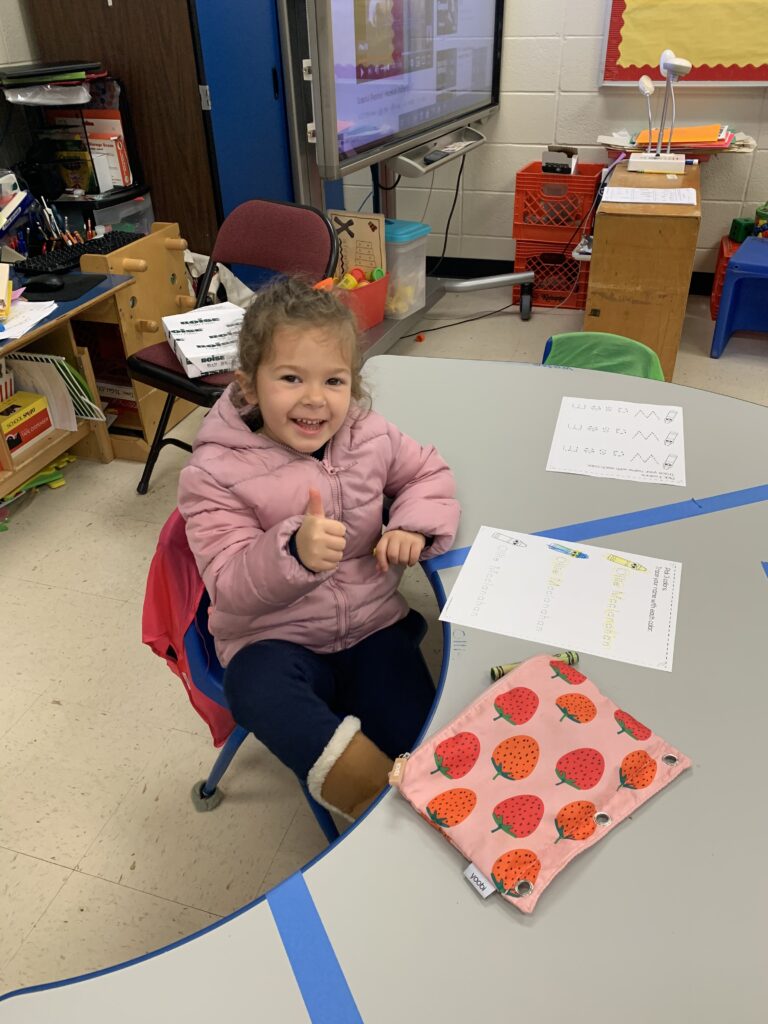 Ollie enjoying one of her favorite foods, bacon and cheese grits